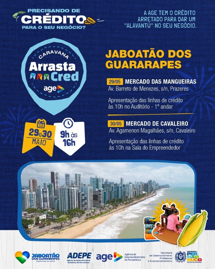 Nos próximos dias 29 e 30 de maio, o município do Jaboatão dos Guararapes recebe a Caravana Arrasta Cred AGE, uma ação que oferece crédito acessível para empreendedores, micro e pequenos empresários, especialmente aqueles que atuam com a comercialização de bens, produtos e serviços durante o período junino.